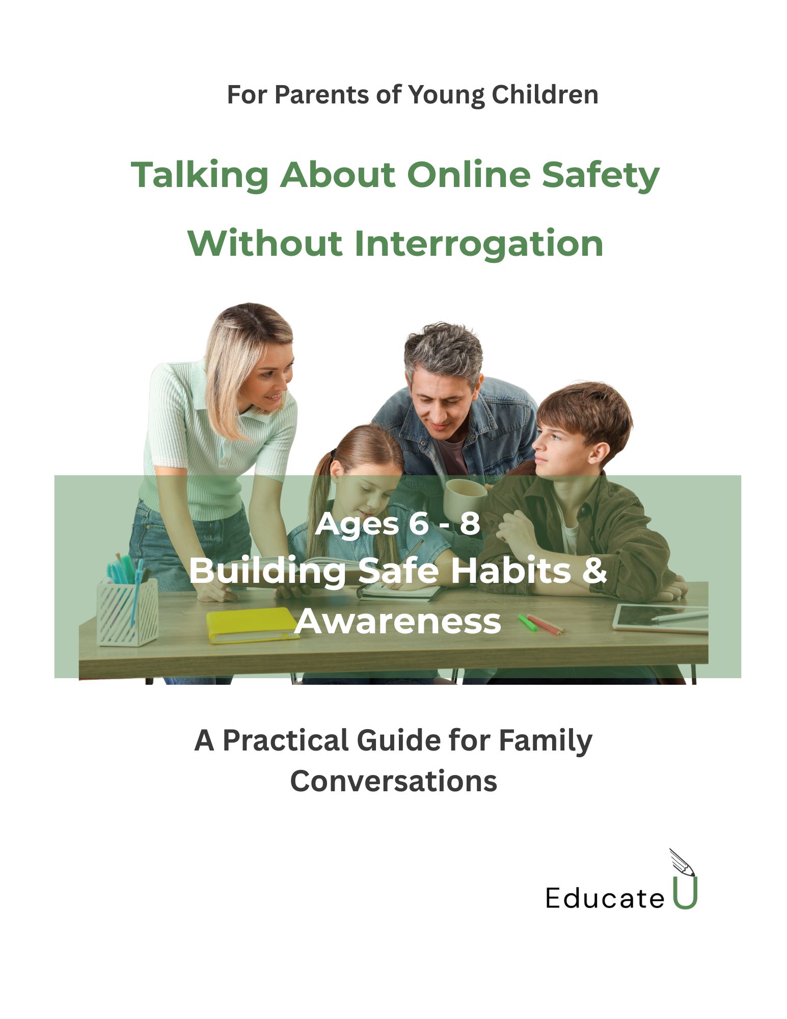 ✔ Step-by-step conversation guides to help you talk about online safety naturally ✔ Simple, real-life examples you can use in everyday situations ✔ Activities to build your child’s awareness of what’s safe and what’s not ✔ Practical guidelines for screen time, boundaries, and supervision ✔ A family technology agreement to set clear, consistent expectations ✔ “What to teach” sections with age-appropriate language and concepts ✔ Parent reflection prompts to help you guide — not control